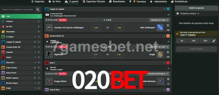 O 020Bet oferece uma grande seleção de opções de apostas em e-sports com probabilidades competitivas